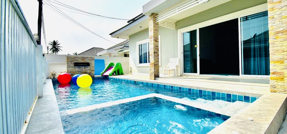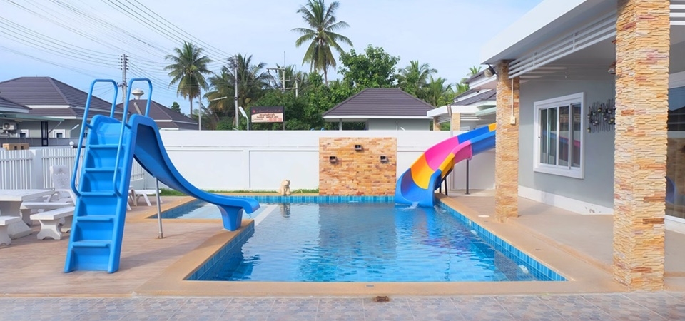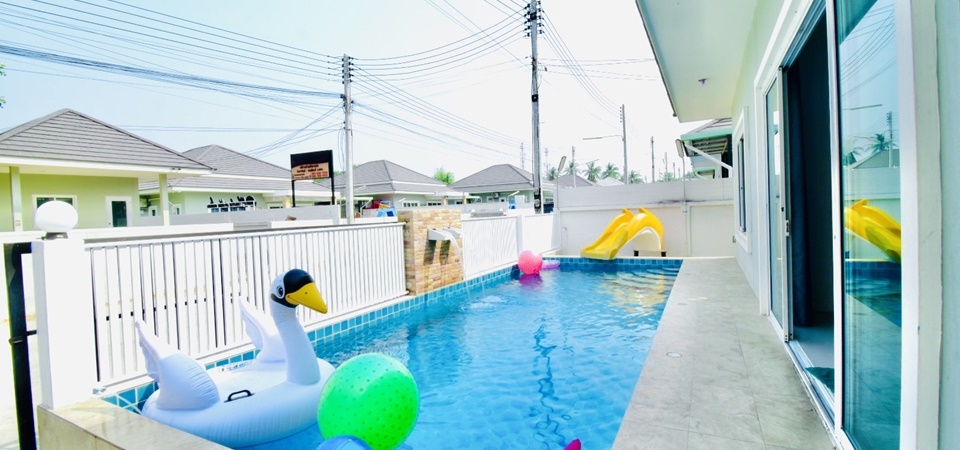 ตั้งอยู่หัวหินซอย 70 บ้านพักสไตล์โมเดิร์น สระว่ายน้ำส่วนตัว สไลเดอร์สุดเกร๋!! มีห่วงยางแฟนซี ขนาด 3 ห้องนอน 3ห้องน้ำ 1 ห้องนั่งเล่น รองรับลูกค้าได้ 12 ท่าน เท่านั้น บริการ!! คาราโอเกะ ไฟเธค แอร์ทั้งหลัง Wi-Fi ฟรี อุปกรณ์ครัว เตาปิ้งย่างครบ ปาร์ตี้เสียงดังได้ถึง 24.00 น.
