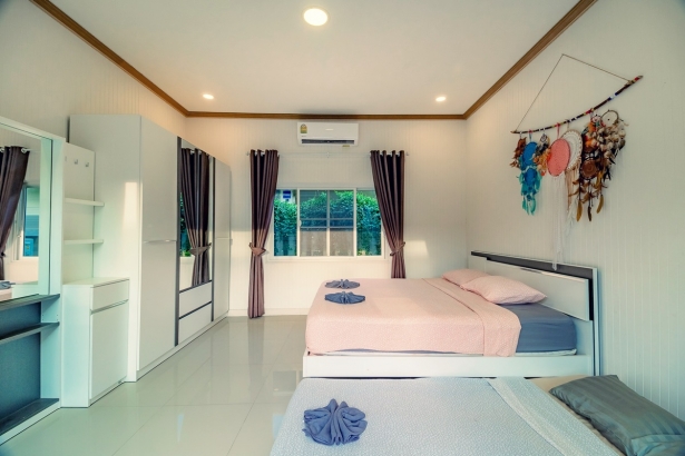 บ้านราตรี 1 : บ้าน 3 ห้องนอน 2 ห้องน้ำ มีเตียง 6 ฟุต 2 เตียง , เตียง 3.5 ฟุต 2 เตียง และฟูกเสริม 5 ฟุต 2 อัน