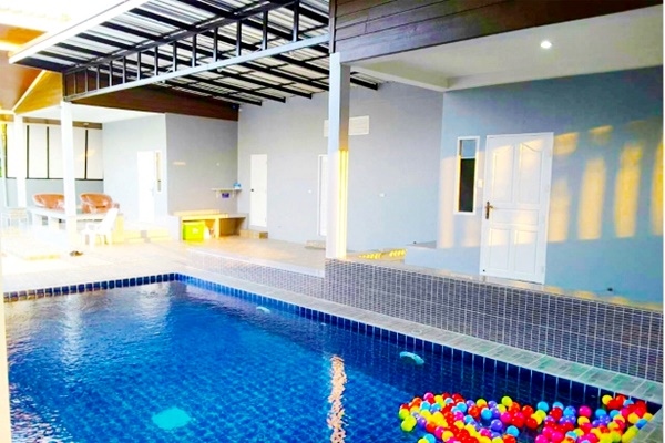มีลักษณะเป็นแบบ 4 ห้องนอน 4 ห้องน้ำ พักได้ 20 ท่าน ติดแอร์ทั้งหลัง มีสระว่ายน้ำส่วนตัว สิ่งอำนวยความสะดวกครบ เช่น เตาปิ้งย่าง, ทีวี, Wi-Fi, อุปกรณ์ครัวมีให้ครบ, ไมโครเวฟ, ตู้เย็น บ้านพักอยู่ห่างจากทะเลขับรถประมาณ 10 – 15 นาที