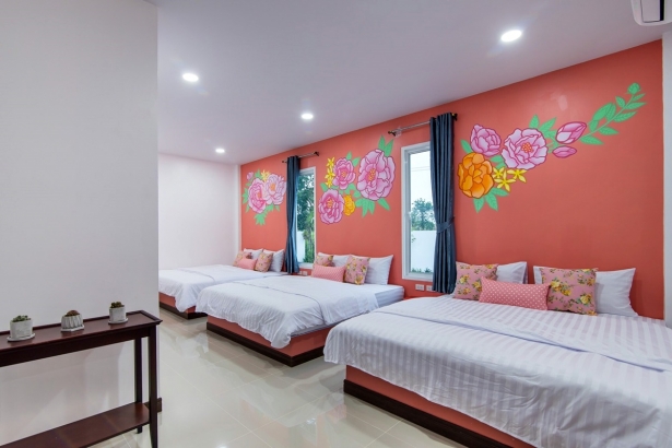 - ห้องที่ 1 มีเตียง 6 ฟุต 3 เตียง ห้องน้ำในตัว