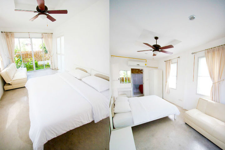 บ้านนอนหมู่ 2 บ้านพักสีขาว 1 ชั้น สามารถพักได้ถึง 4 – 6 ท่าน ห้องพักมี 1 ห้องนอน และ 1 ห้องนั่งเล่น มีมุมประกอบอาหาร โต๊ะอาหาร โซฟาเบด มีห้องน้ำ 2 ห้อง อยู่ในบริเวณห้องนอน 1 ห้อง และ บริเวณห้องนั่งเล่น 1 ห้อง ห้องนอน มีเตียง คิงไซส์ 1 เตียง ท่านที่ 3 – ท่านที่ 6 ที่นอนเป็นลักษณะยางพาราปูพื้น ห่างจากทะเลเพียง 80 เมตร
