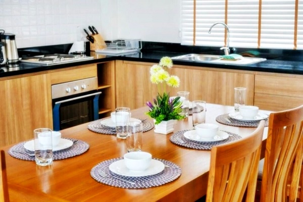 - อุปกรณ์ครัวครบ (ตู้เย็น,ไมโครเวฟ,กาต้มน้ำไฟฟ้า,กะทะ,หม้อต้ม,หม้อหุงข้าว,เครื่องปิ้งขนมปัง,เตาไฟฟ้า,เตาอบ)